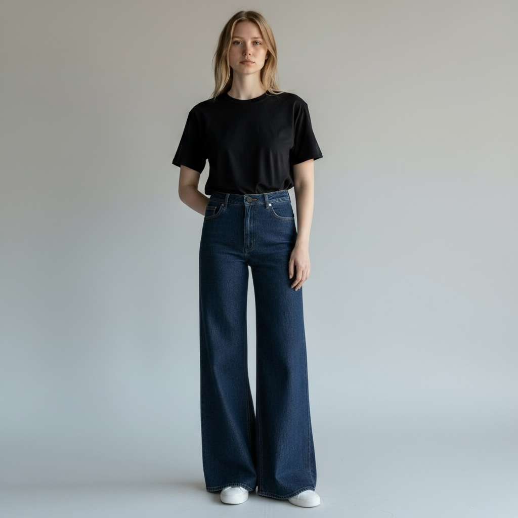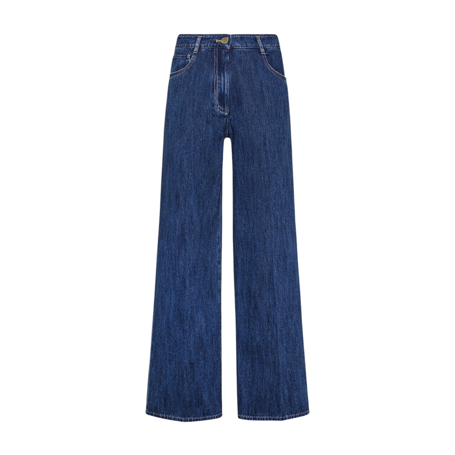 • Pantalon denim indigo, évasé en bas. Taille élastique à l’arrière