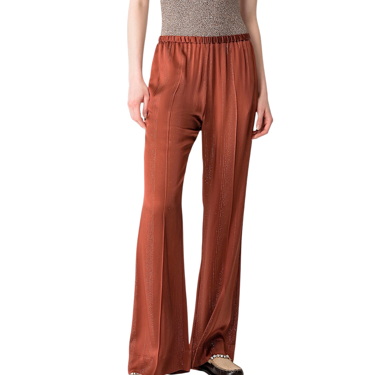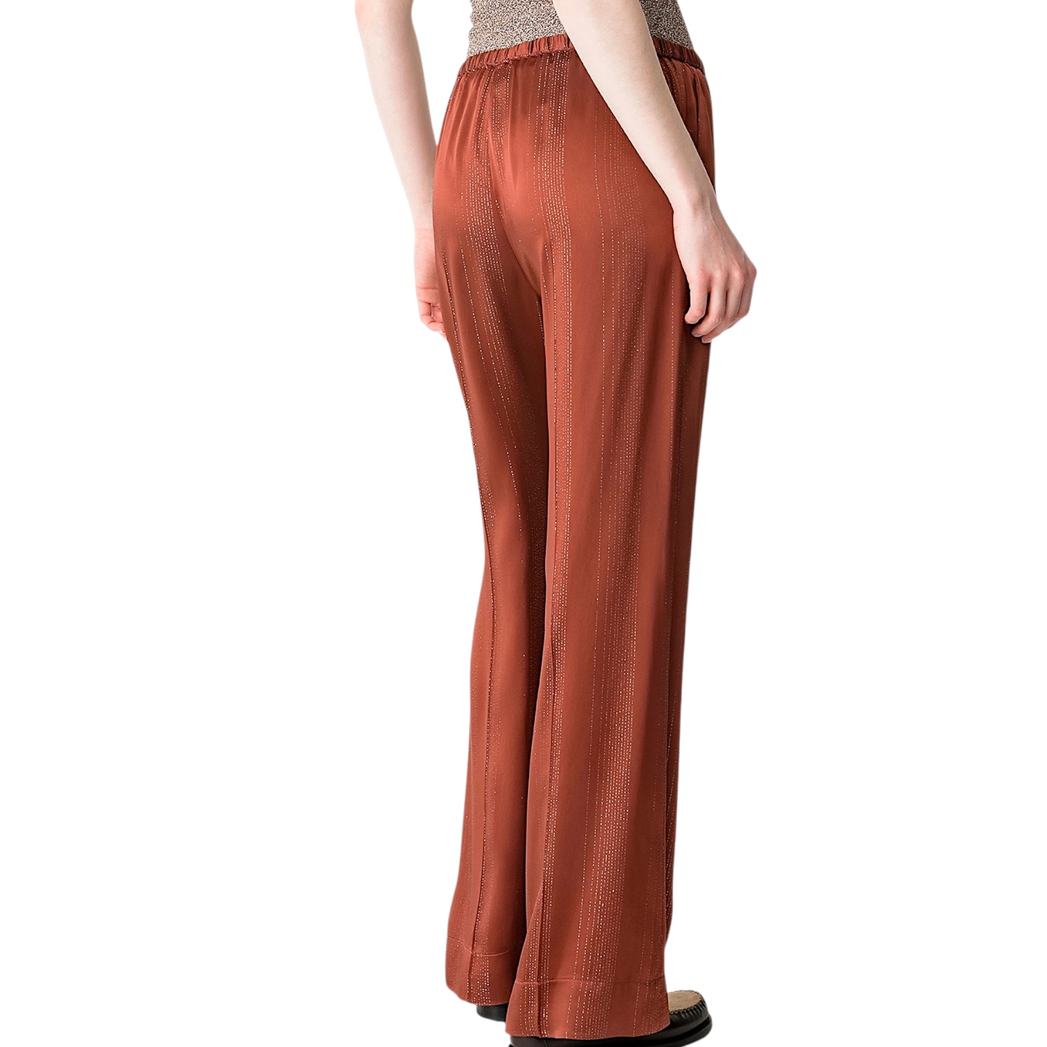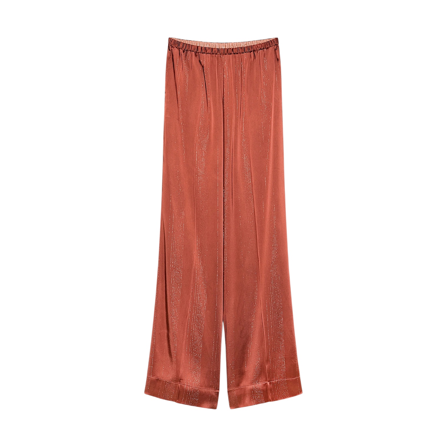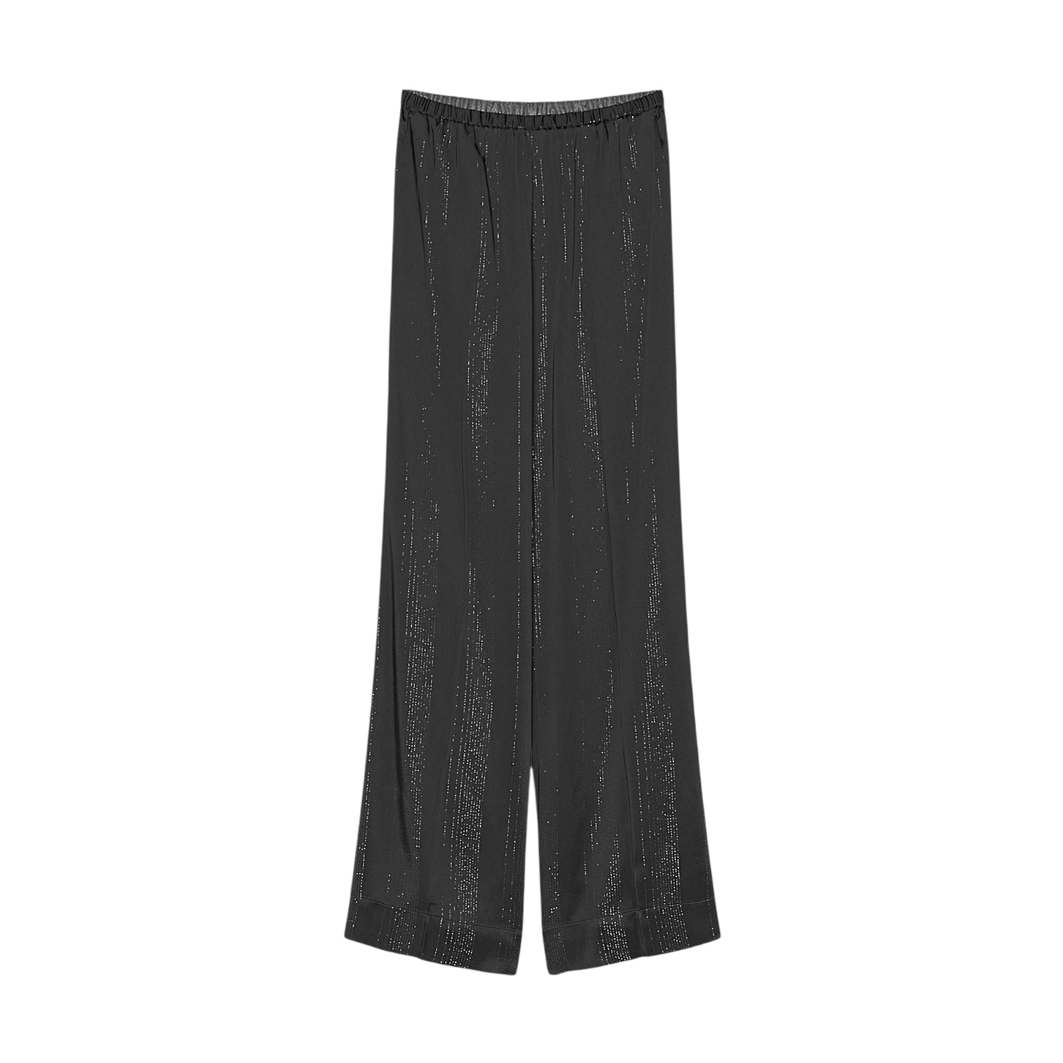 Satin à fines rayures, agrémenté de fil de lurex, taille élastiquée, coupe droite, fond evasé