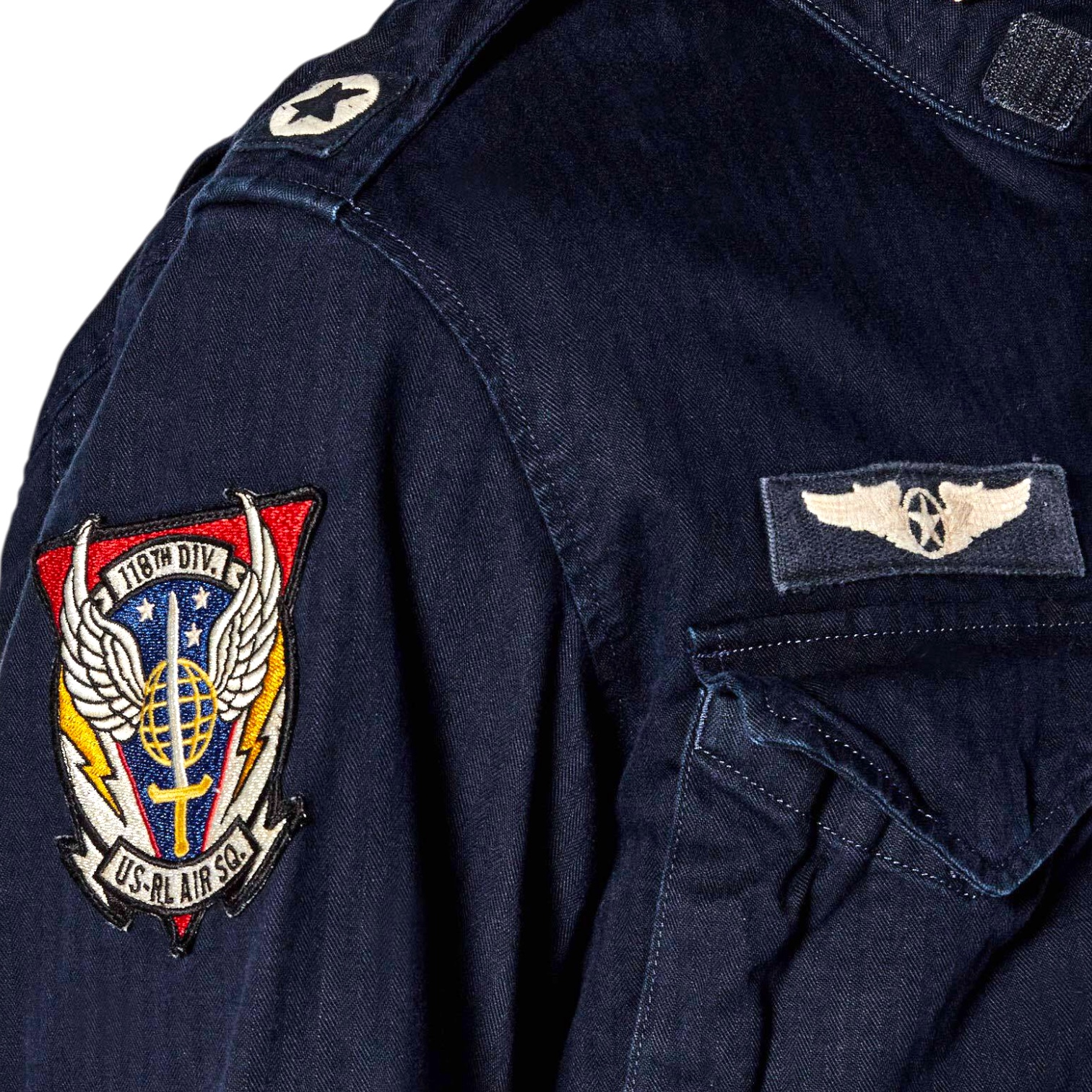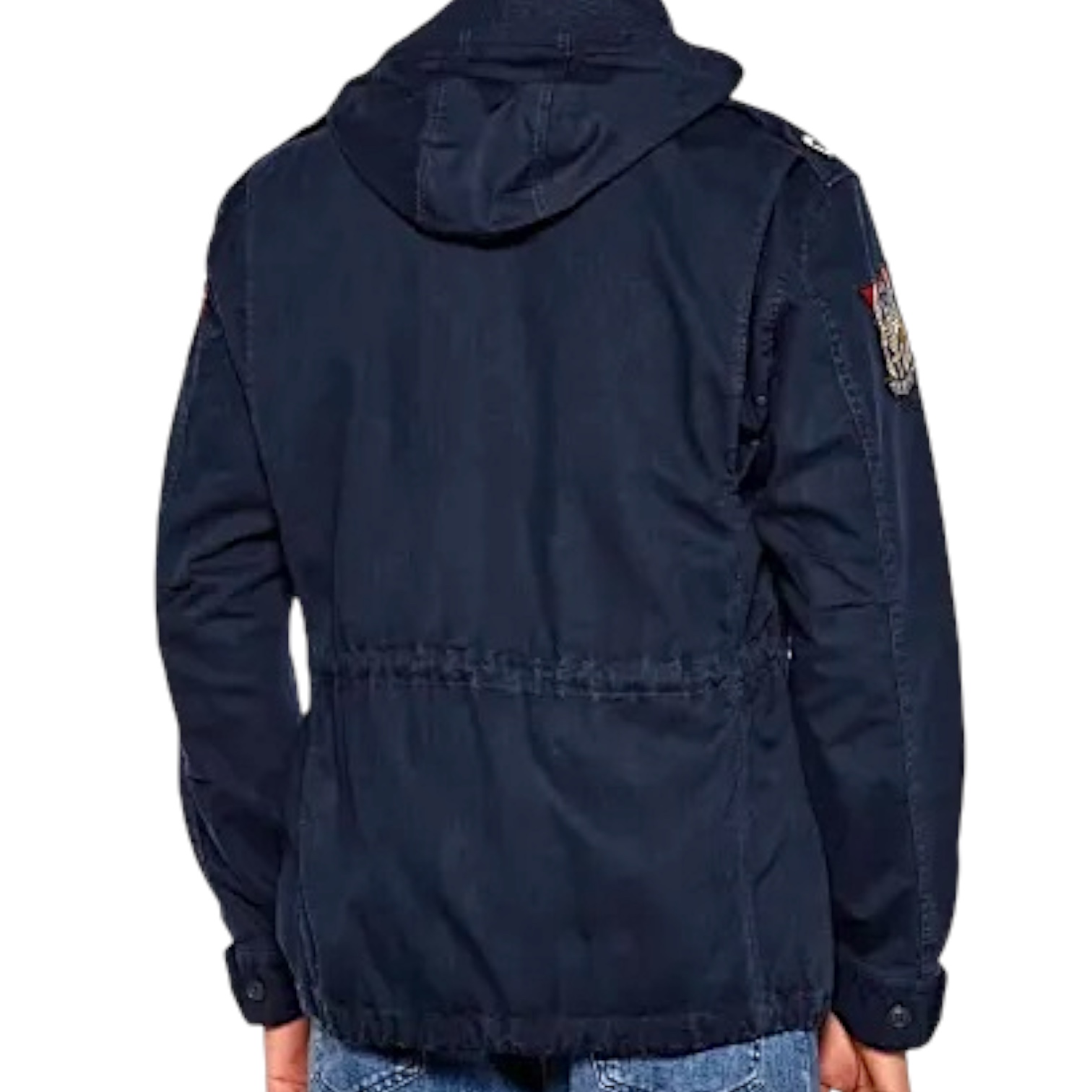 - Epaulettes boutonnées, écusson étoile sur chaque épaule, écussons inspirés des surplus sur chaque manche, écusson « u.s.-patch « u.s.- r.l. » sur la poitrine gauche, patch étoile ailée sur la poitrine droite
