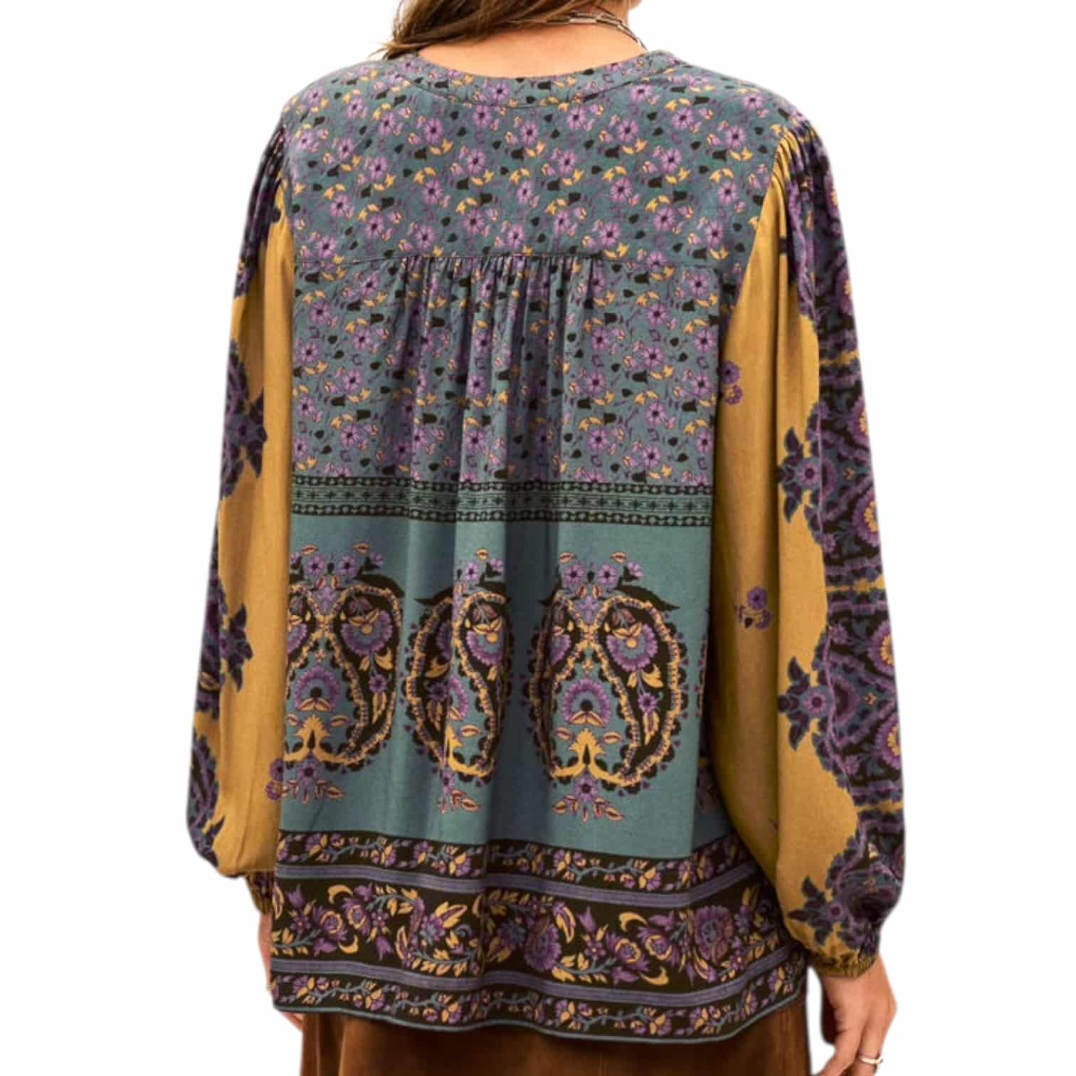 -Coupe ample – Col tunisien avec lien – Fronces sous découpe épaule et dos – Manches longues loose avec bas élastiqué – Fronces en tête de manche