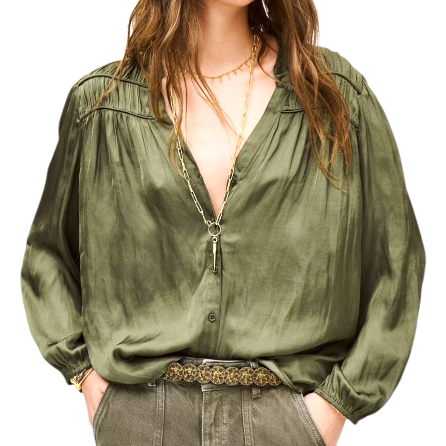 – Coupe ample – Fermeture boutonnée – Encolure en V – Poignets resserrés – Col volanté – Biais incrustés