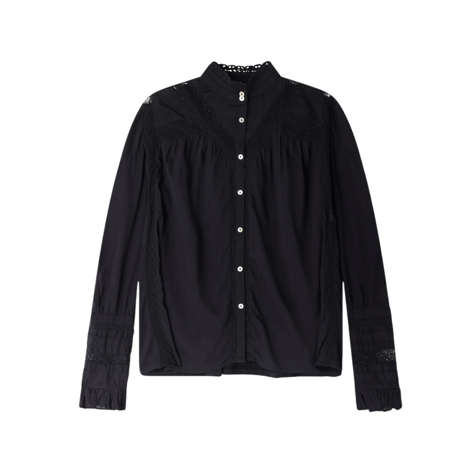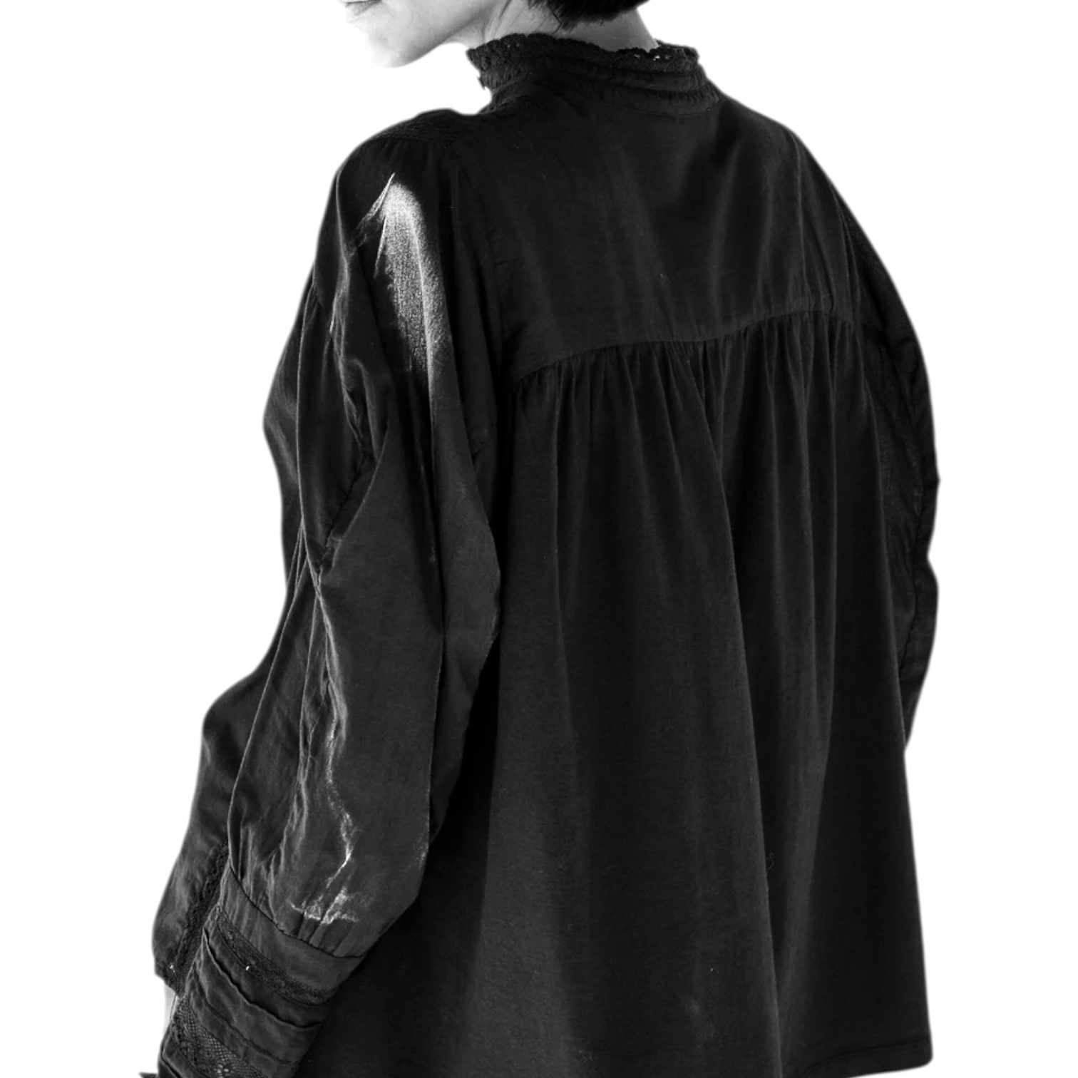 Col montant façon crochet, une fine dentelle orne les épaules et les poignets, soulignée par de petits volants légers, ouverture boutonnée