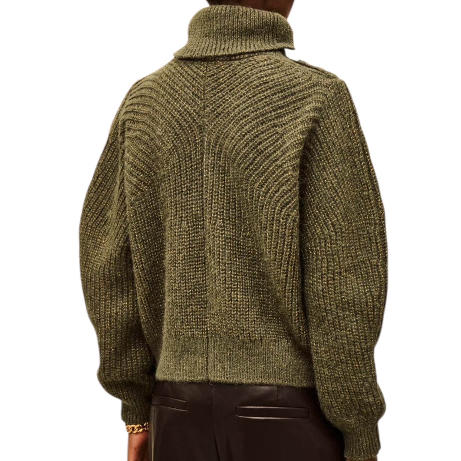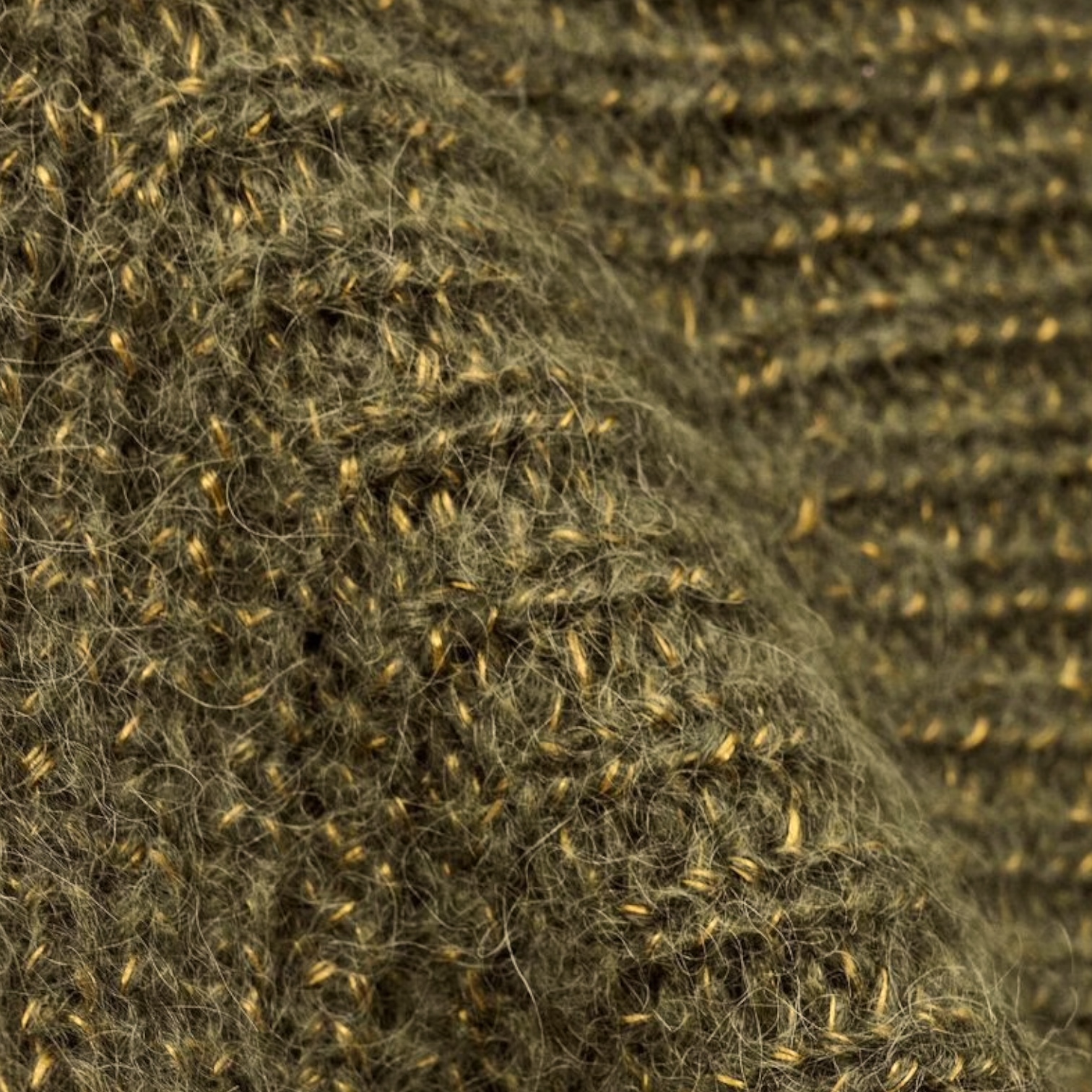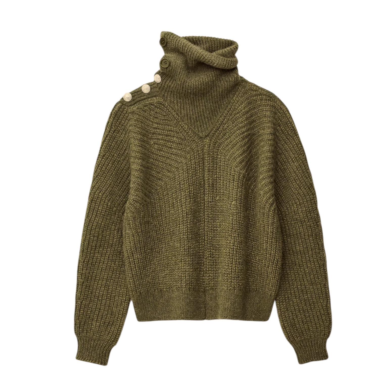 Coupe courte, col montant agrémenté de boutons permettent de jouer sur l’ouverture, maille travaillée en diagonale